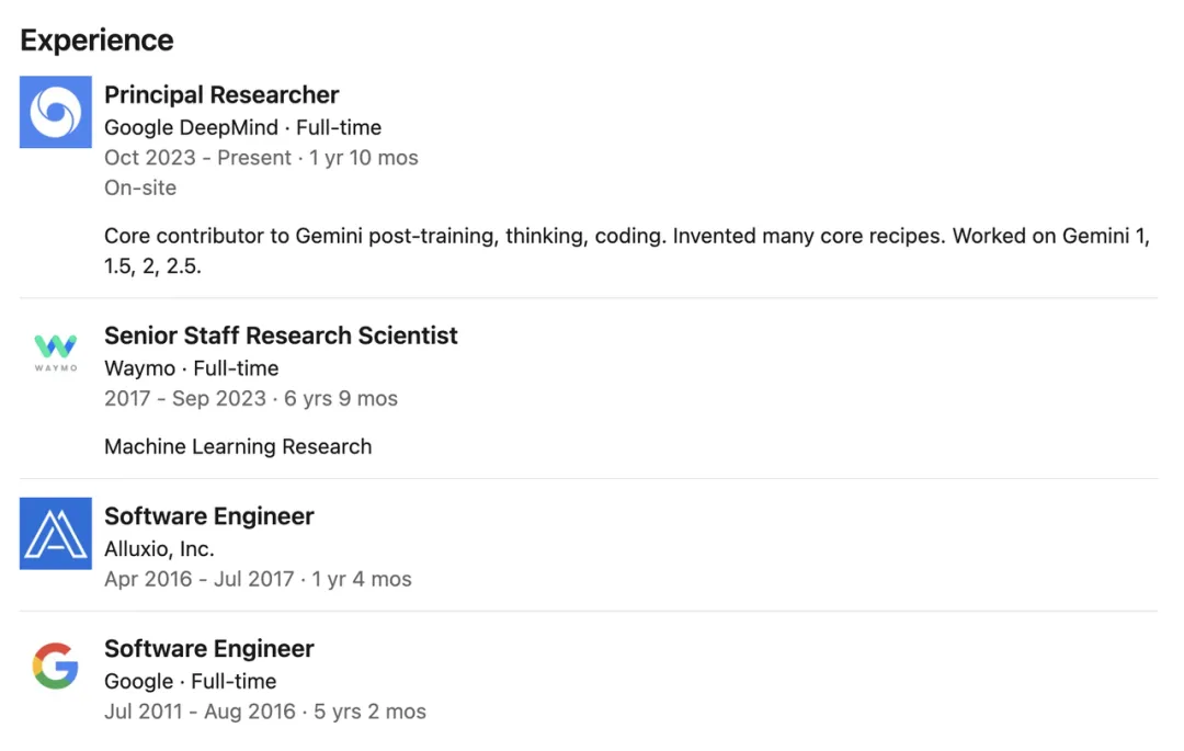 他曾在Google DeepMind担任首席研究员,期间主攻Gemini模型的后训练、编程和推理工作,是Gemini系列模型(包括Gemini 1、1.5、2和2.5)后训练、思维机制构建与代码实现的核心贡献者之一。
