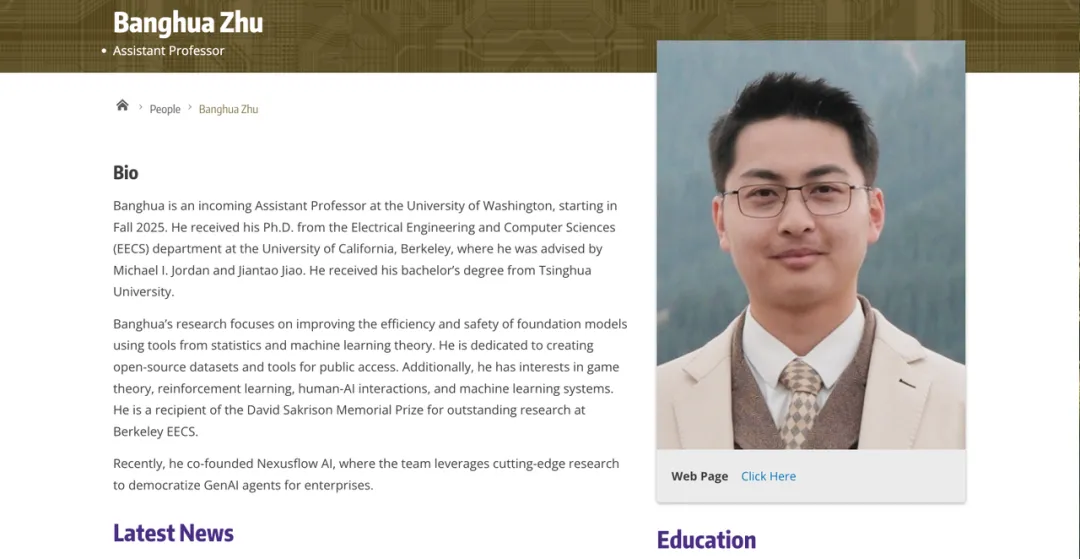 Banghua Zhu本科毕业于清华大学电子工程系,后赴美国加州大学伯克利分校攻读电气工程与计算机科学博士,师从著名学者Michael I.Jordan和Jiantao Jiao。