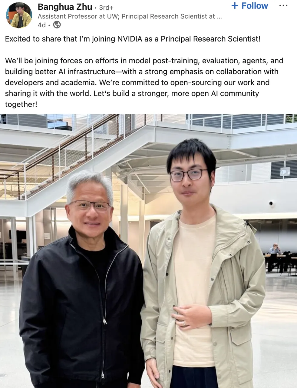 他曾在Microsoft担任研究实习生,在Google担任学生研究员,曾联合创立AI初创公司Nexusflow,今年6月,他宣布加入英伟达Star Nemotron团队担任首席研究科学家,此外将于今年秋季入职华盛顿大学的助理教授。