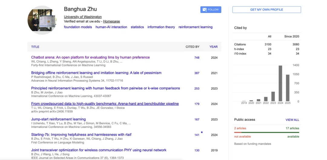 此外,他还在RLHF、人类反馈对齐、开源对齐模型等方向有所贡献。其Google学术显示引用总数超过3100,h指数为23,也是大模型竞技场“Chatbot Arena”、“Benchbuilder”、“Starling”等多个热门开源项目的核心作者之一。