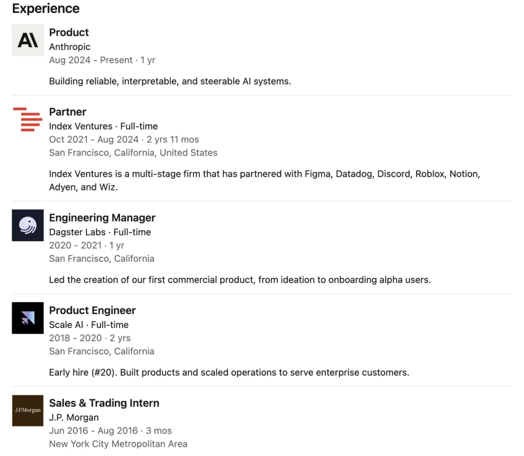在加入Anthropic之前,她曾是知名风投公司Index Ventures的合伙人,任职近三年,期间深度参与多家顶尖创业公司的早期投资与战略支持。