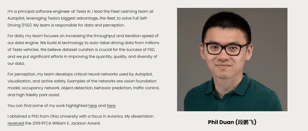 段鹏飞(Phil Duan)是特斯拉AI的首席软件工程师,现负责Autopilot下的Fleet Learning团队,致力于推动特斯拉自动驾驶系统(FSD)中“数据+感知”核心模块的建设。