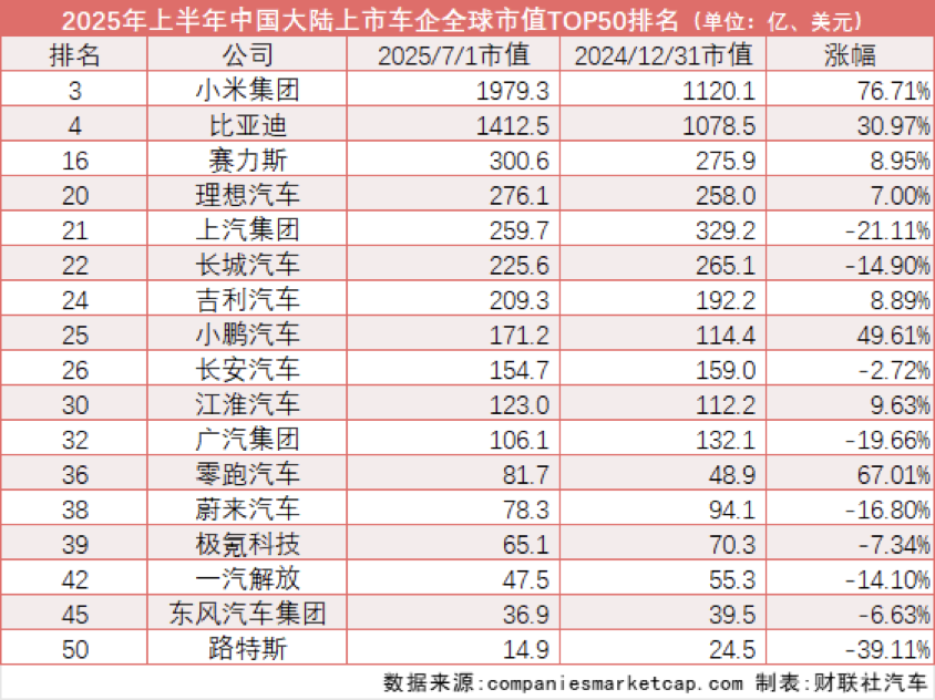 2025年上半年全球市场的风云激荡,在全球车企市值排行榜上体现得淋漓尽致。其中,中国大陆车企以销量与技术双轮驱动市值增长,在全球车企市值五十强中占据17席,并正藉此重塑着行业竞争版图。