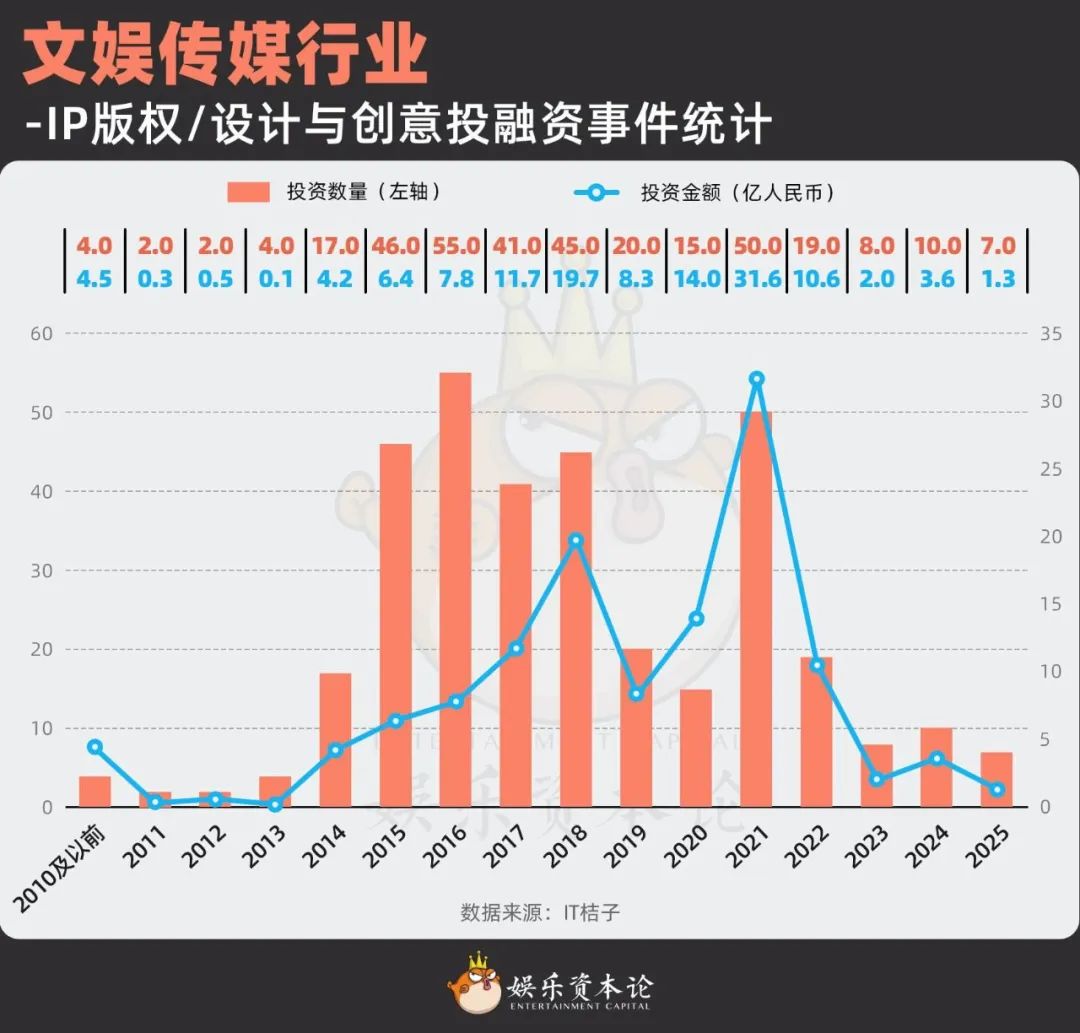 图6 文娱传媒行业-IP版权/设计与创意投融资事件统计,数据来源:IT桔子