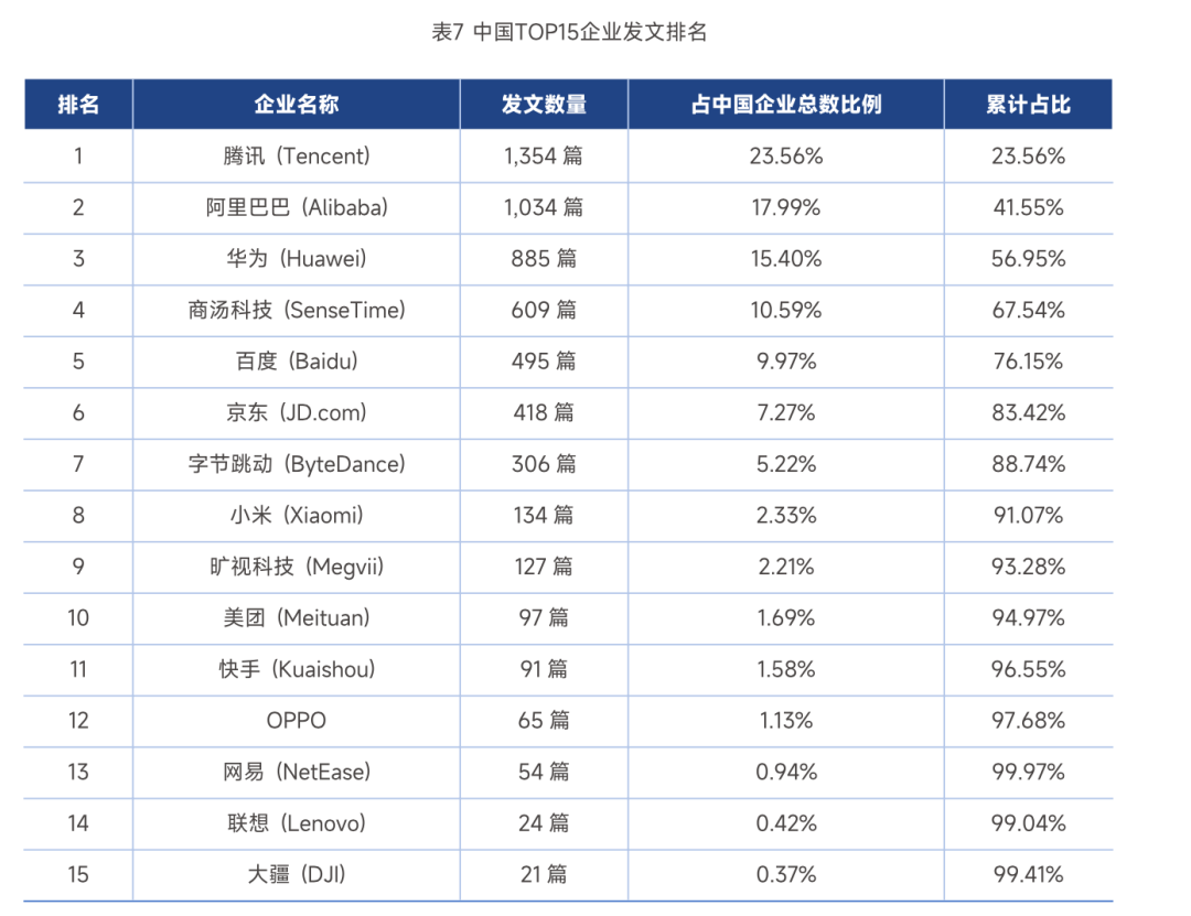 中国发文最多的前三名企业分别为腾讯(1,354篇)、阿里(1,034篇)和华为(885篇),而美国前三名企业为谷歌(2,895篇)、微软(1,582篇)、Meta(1,419篇)。
