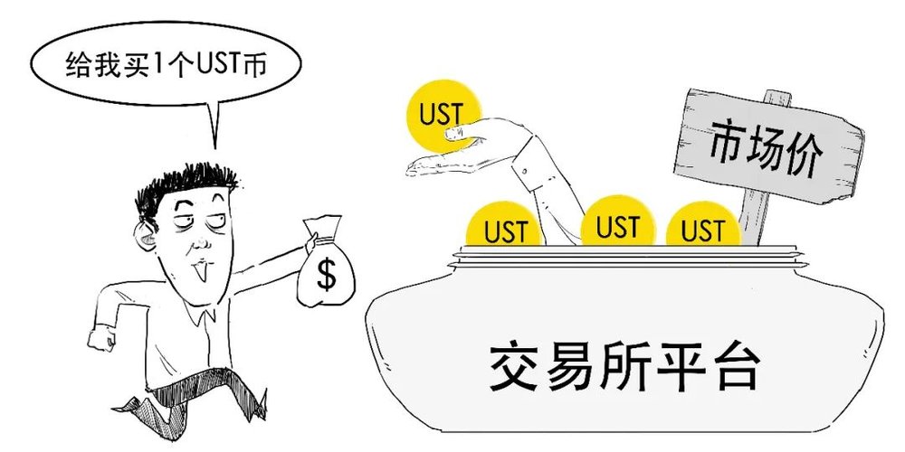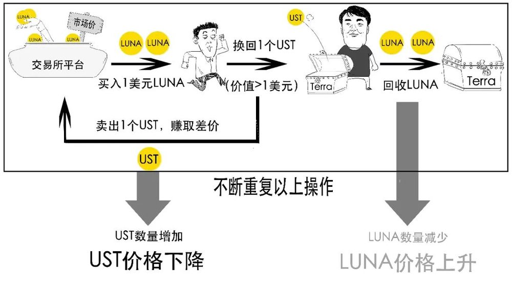 我们假设当1UST=0.5美元。于是,一个人嗅到了赚钱的机会,他选择在市场上花0.5美元买下1个UST。
