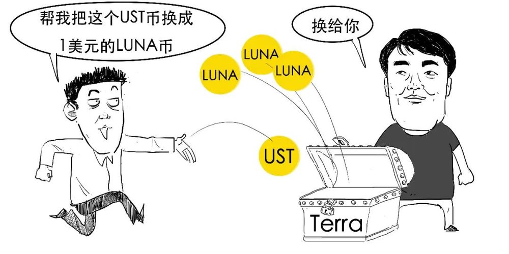 然后他就会利用Terra的互换机制,把这些价值1美元的LUNA币换成1个UST。