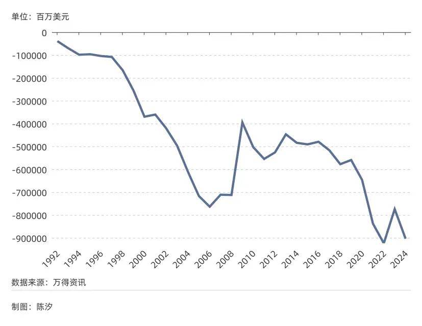 图4: 美国贸易逆差(1992年~2024年)