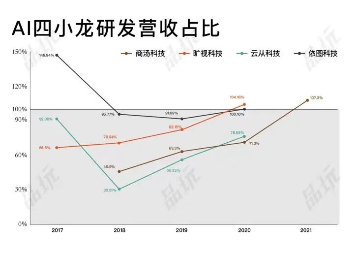 创投圈有个共识:“投人工智能要先投科学家”。算法工程师间的技术、经验差异仍决定着算法模型的生产力高低,百万年薪招AI大牛在业内是再普通不过的事情。商汤科技的创始人徐立甚至表示公司成立之初就将大约一半的资金用在了人才招聘上,其一家公司就囊括了40位教授、250多名博士和博士生,以及3593名科学家和工程师。因此,四家企业的研发支出异常高昂,甚至一些企业当年的研发支出已经超过了全年的总营收。
