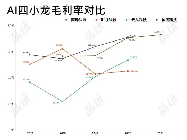高营收,高亏损背后另一个需要考量的就是AI企业主要营收产品背后的毛利率。四家公司在毛利率的变化上较大,最高的商汤科技2021上半年可以达到73%,最低的云从科技2018年仅为21.7%。云从表示,其主营业务中的人机协同操作系统是标准化的产品,相关研发产生的人员薪酬计入研发费用,因此毛利率相对较高,而人工智能解决方案业务由于需外购部分配套软硬件产品或服务,外购材料成本较高,因此毛利率较低。