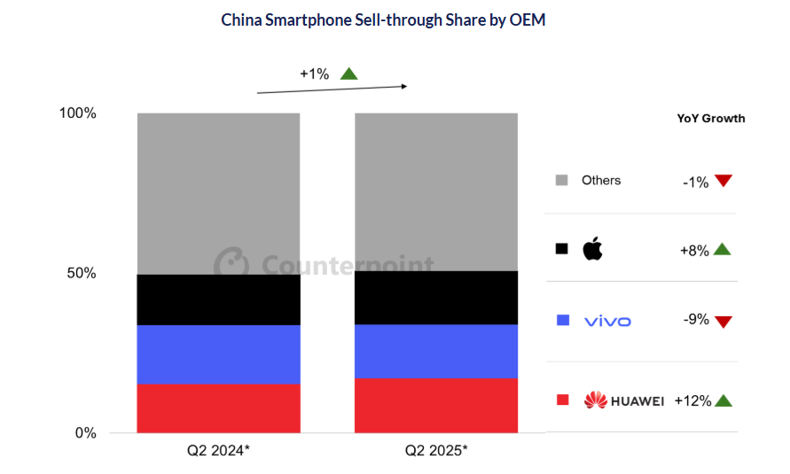 Counterpoint的数据显示,华为第二季度的销售额同比增长了12%。第二季度,华为是中国市场份额最大的公司,其次是Vivo,第三位是苹果。