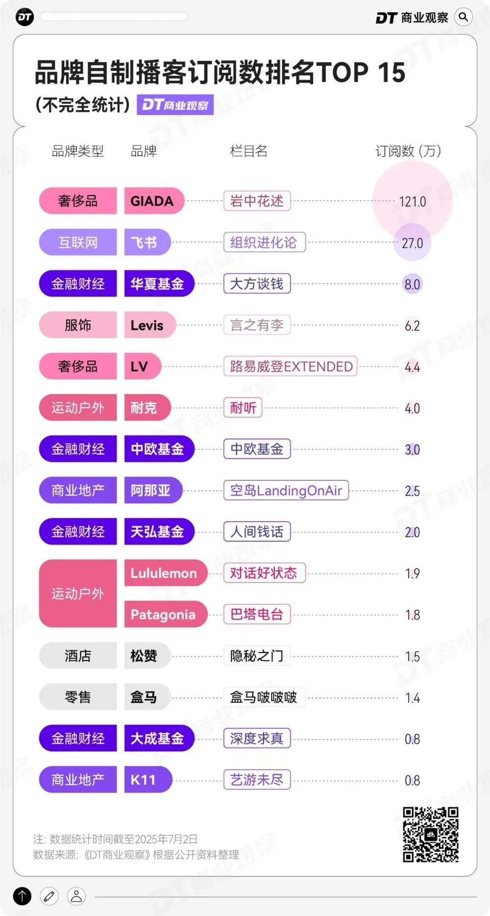 根据《DT商业观察》的不完全统计,过去五年间,超30个品牌/公司开始自制播客。
