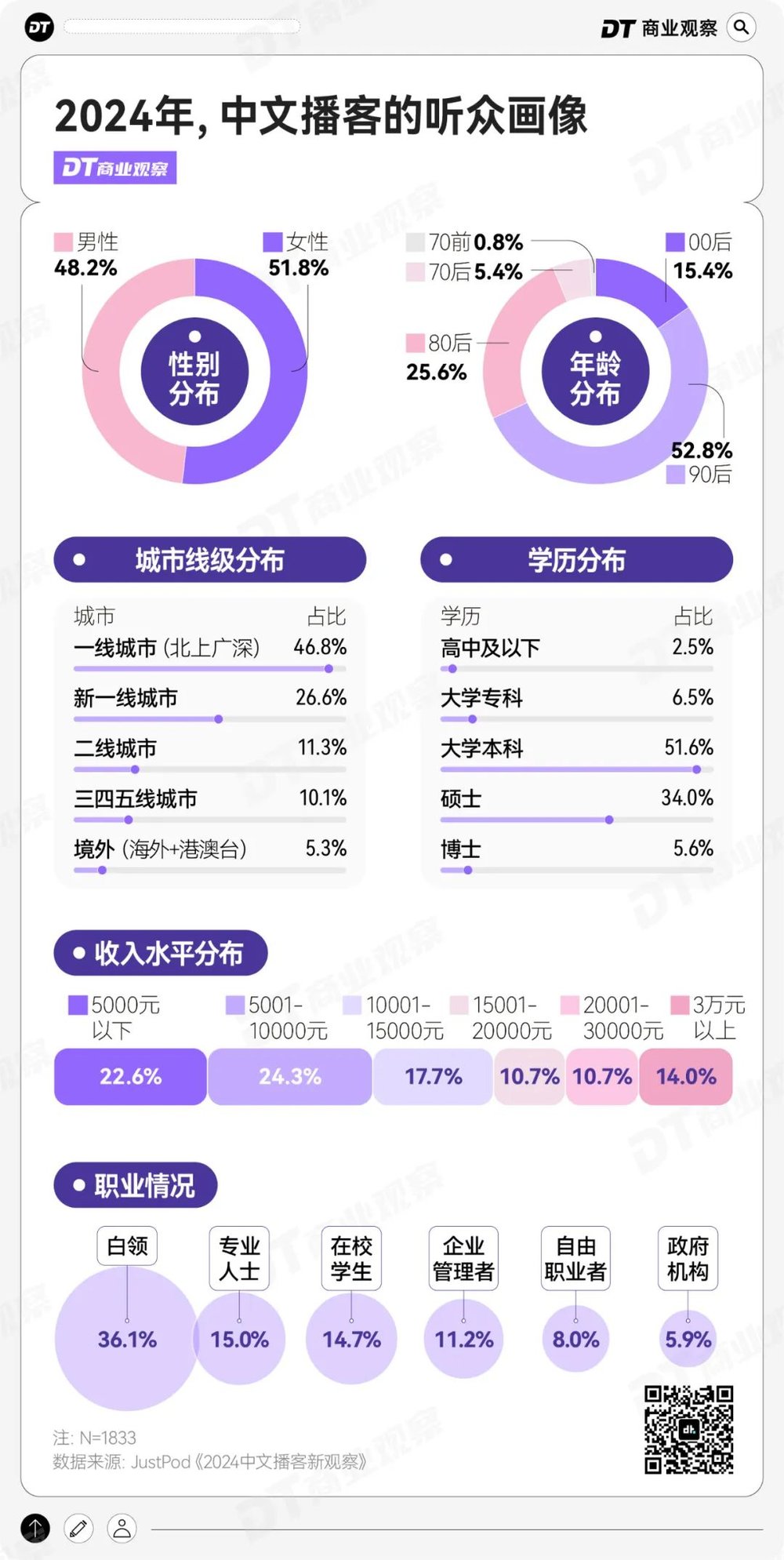 根据Just Pod发布的《2024中文播客新观察》,播客的听众普遍年轻,90后、00后占比近7成,他们往往接受过良好教育(一线及新一线城市的人群占比超70%,大学本科及以上的人均占比超9成)、整体收入水平较高。