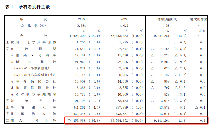 JPX的年度持股调查数据显示,2024财年(截至2025日历年3月31日),日本散户的数量达到83,594,852人,较前一年增加了9,141,264人,为该机构1949年开始统计以来的最大增幅。