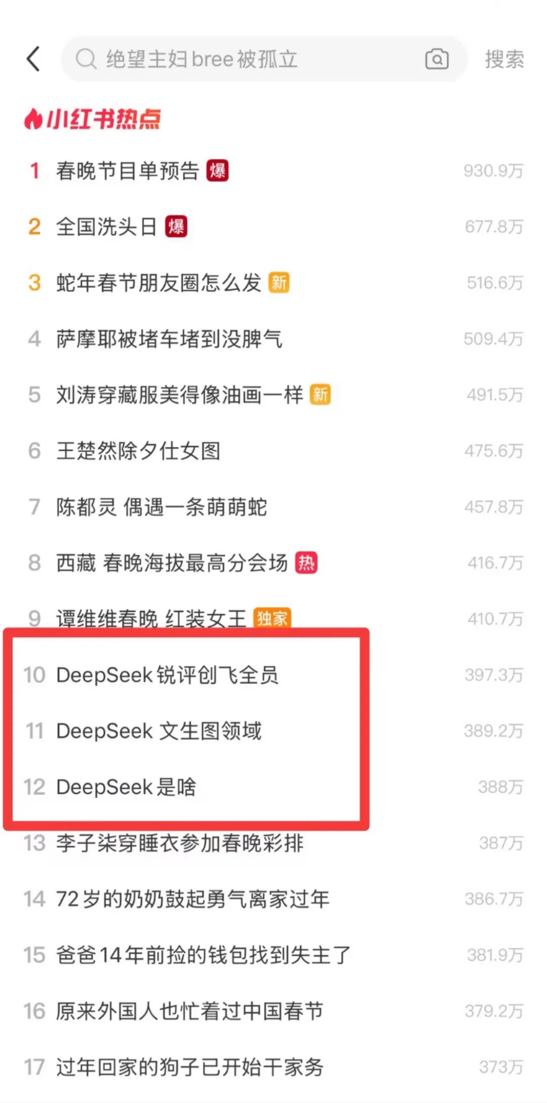 一个具有反差感的例子是,AI等科技热点在小红书上的火爆。无论是AI恋爱、独立开发这样的圈层热点,还是Deepseek春节期间的全民讨论,这些科技热点越来越多诞生在小红书上。