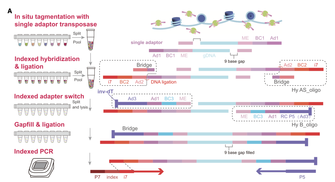 图1(原图1A)UUATAC‑seq的实验流程与“四轮池拆条码”设计,高效完成单细胞染色质检测。第一步,利用特殊的酶给每个细胞的DNA打上初始标签条码;第二步,细胞混合后,再给每个细胞添加一个独特标签;第三步,通过温度控制的方式精确加入第三个标签;最后一步,通过DNA扩增加入第四个标签,完成单细胞水平的染色质分析。