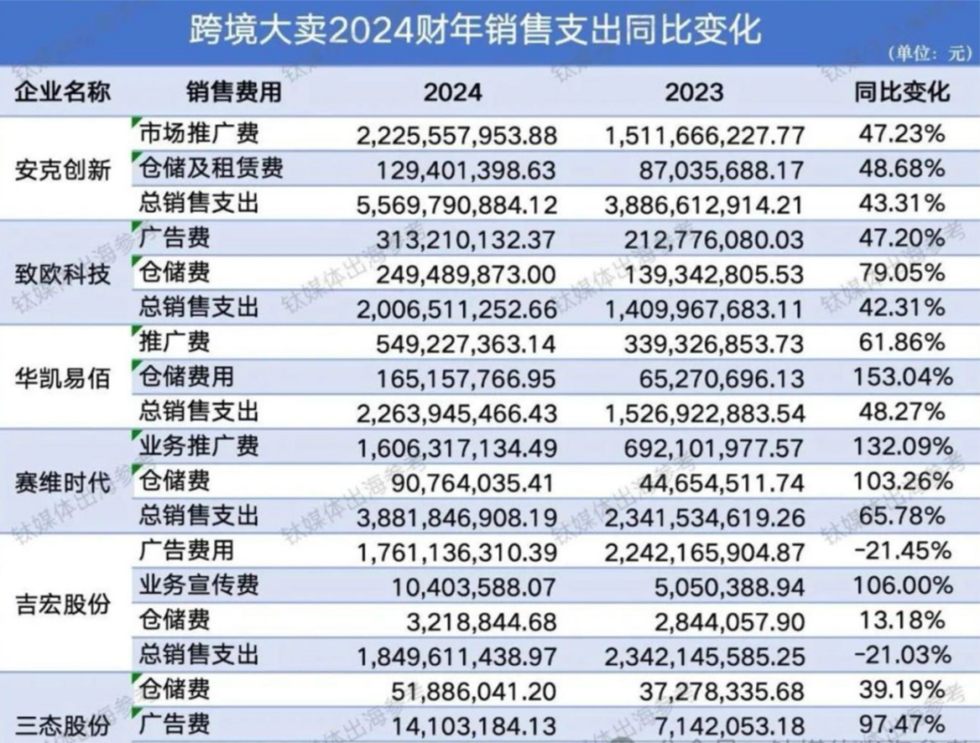 2024年,三态股份的广告费同比高出97.47%,赛维时代业务推广费同比更是上涨132.09%,赛维时代的仓储成本也同比升高了103.26%,华凯易佰的仓储费用2024年同比2023年暴涨153.04%。