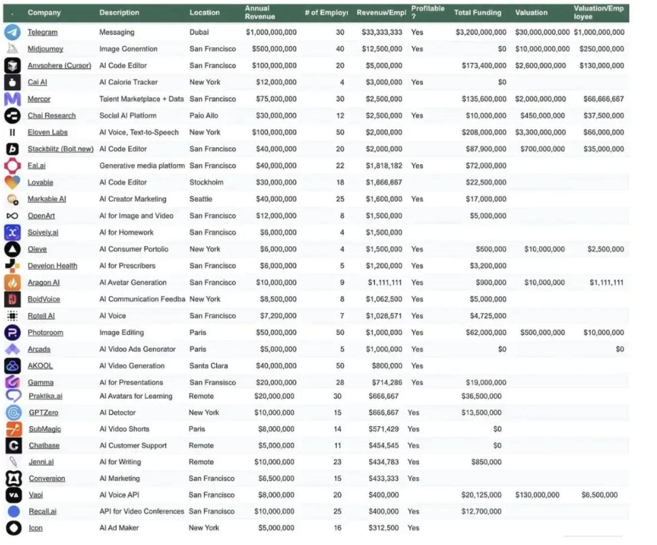 据悉,Manus裁掉的大部分是非核心技术岗,这也符合目前AI公司的组织结构和公司规模。在虎嗅接触的这一轮AI应用初创公司,人数极为精简,团队在20人左右的比比皆是,与此相比,Manus的120人对于一家初创公司来说,属实有些臃肿,人效比过低了,而对Manus来说,相比于营销,打磨产品更为重要。这份由一位连续创业者整理的AI原生公司排行榜名单,其平均员工人数为22人,基本都是不超过50人的团队。