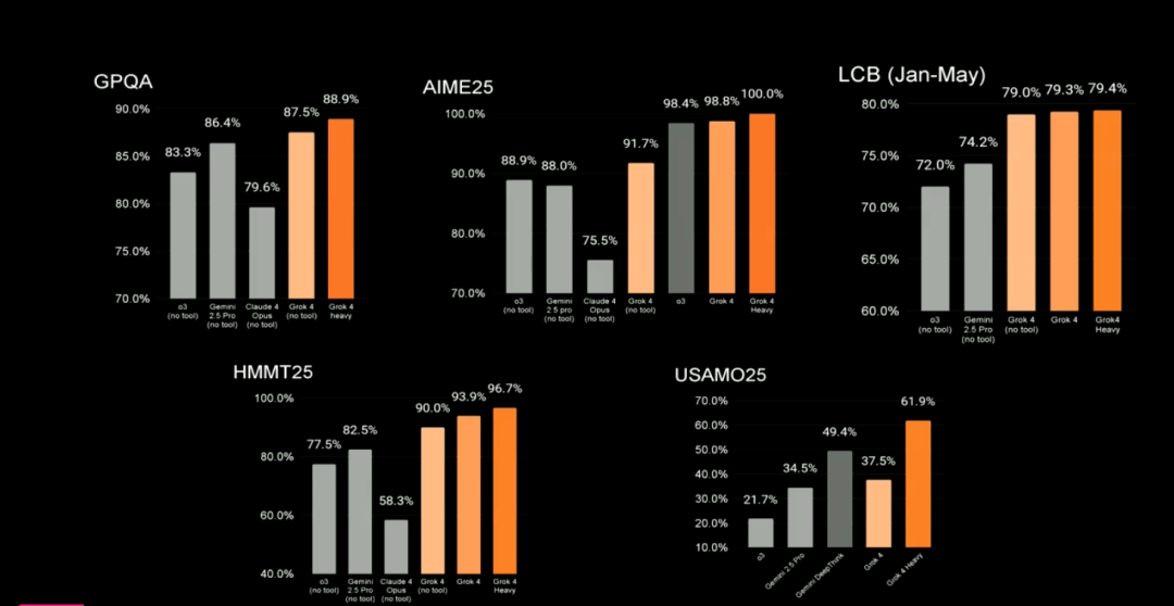 根据xAI数据,Grok 4在不使用任何工具的情况下,得分为25.4%,超过了Google Gemini 2.5 Pro的21.6%和OpenAI o3(高配版)的21%。