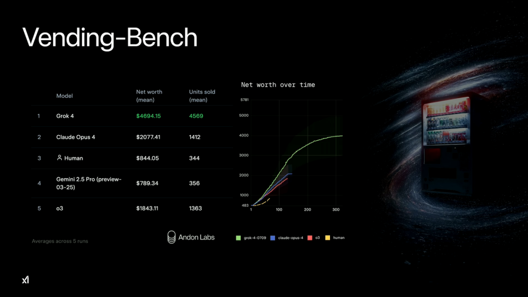 测试结果显示,Grok 4不仅登顶排行榜,而且它所获得的净资产是其他模型的两倍。连马斯克都开始调侃说:“以后买显卡的钱,可以让Grok去部署运营一百万个自动售卖机赚回来”。