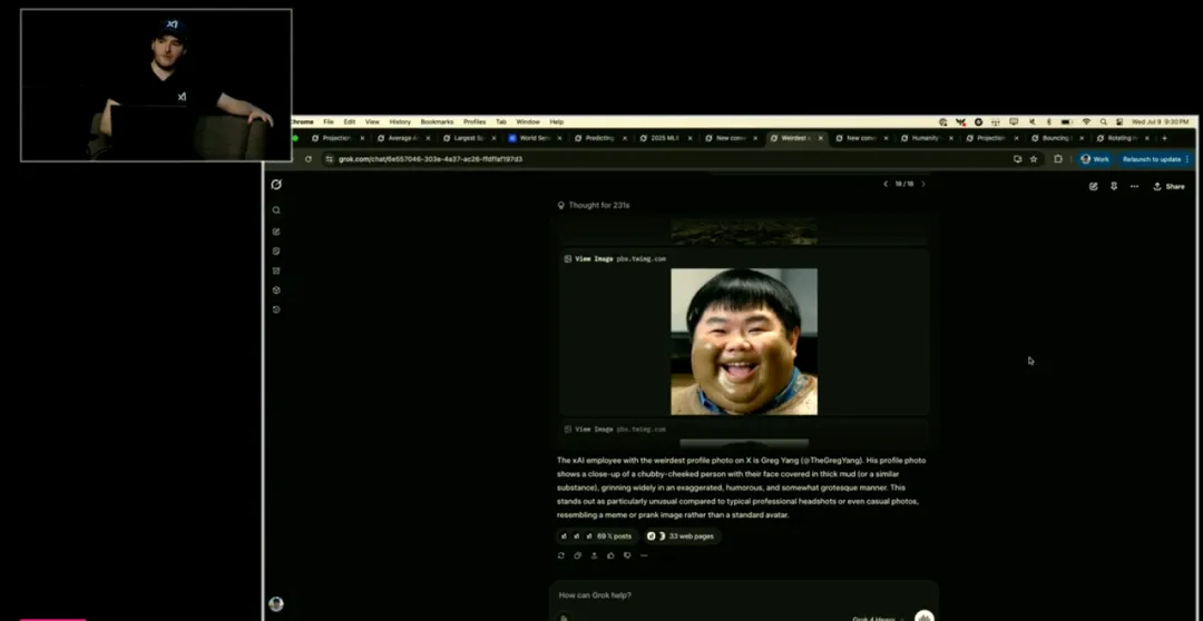 再比如,让它找出xAI团队里头像最奇怪的那一个。依托X平台的资料库,模型自动抓取并分析头像风格,最后锁定了联合创始人Greg Yang。