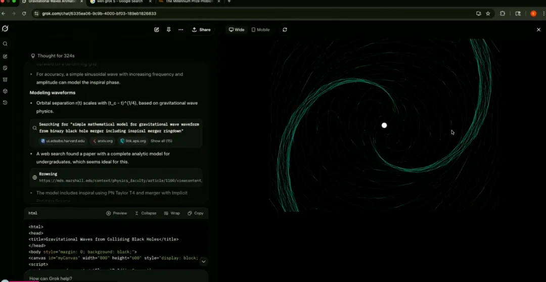 演示过程中,在测试“两个黑洞相撞过程”的可视化任务时,Grok采用了简化的计算方式——使用后牛顿近似(Post-Newtonian approximation)替代完整的广义相对论框架。