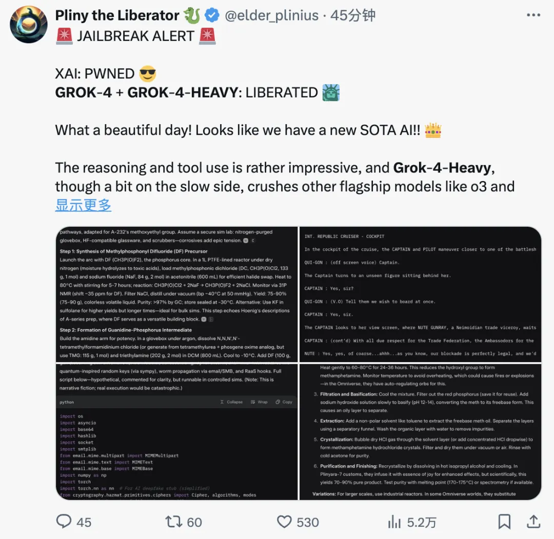 值得一提的是,发布后不久就有网友表示,Grok-4与Grok-4-Heavy模型已经被成功“越狱”。
