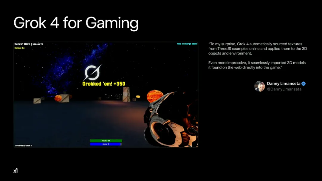 此外,像是金融领域、游戏开发等项目,都可以通过xAI API来使用Grok 4来实现。发布会上特别提到了一个游戏设计师,他在xAI发布了Grok 4预览API后,就立刻参与测试。然后,他花了短短4小时就做出了一个第一人称射击游戏。
