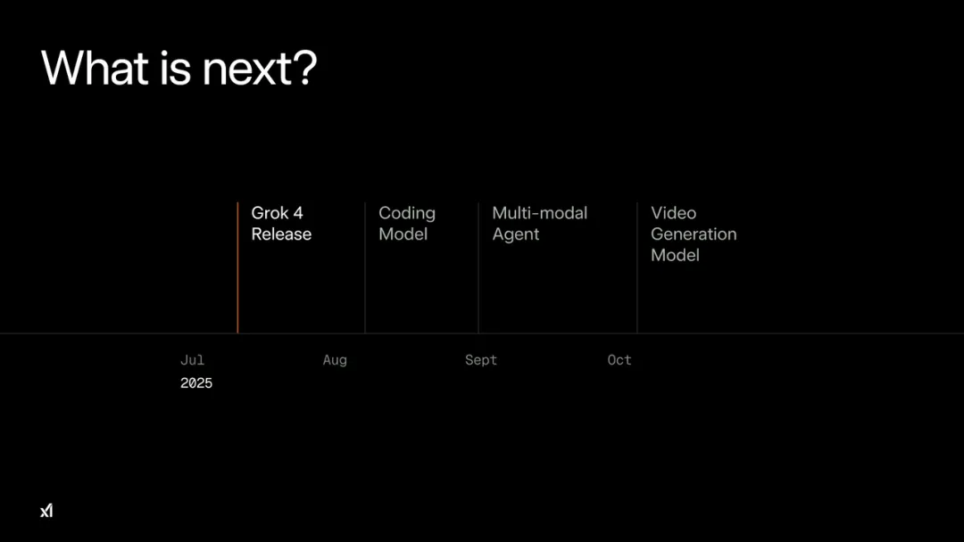 Grok 4不是终点。发布会最后预告了接下来的路线图,每一项都非常值得期待。