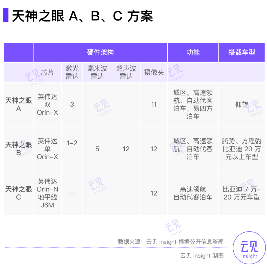 这是一套基于地平线 J6M 或英伟达 Orin-N 芯片的纯视觉方案,可以实现高速导航辅助驾驶(NOA)等功能。在 20 万以上市场,这属于辅助驾驶的低配方案。但比亚迪将其标配在 10 万级别的车型上,认为这会形成差异化的竞争优势。