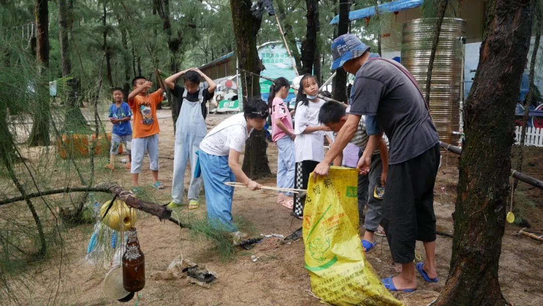 我们的舞台也是自己搭的,用两根竹竿摆了一个叉❌,上面挂着各种海洋垃圾,表示“不要丢垃圾”。