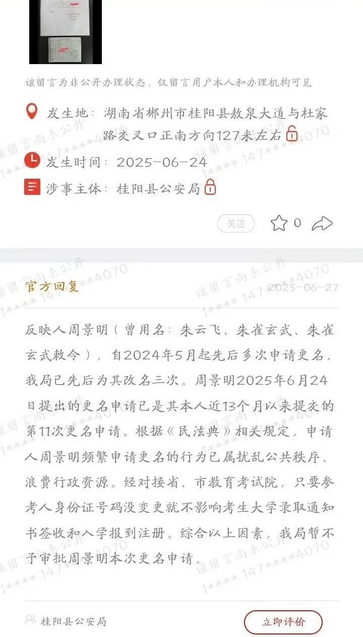 从2024年5月开始,他先后提交11次更名申请,包括“朱雀玄武”“朱雀玄武敕令”“周黄帝武则天”“周乔治·华盛顿”等,在网络上引发争议。