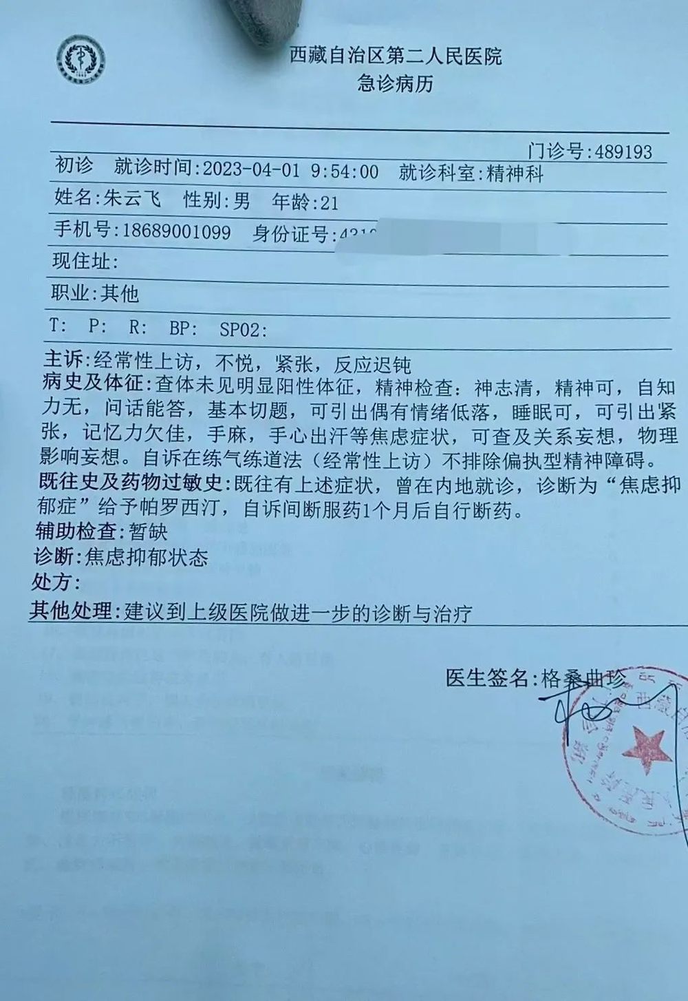 第三,班主任和辅导员带我到西藏第二人民医院精神科就诊,诊断书上写着“自诉在练气练道法,不排除偏执型精神障碍”;