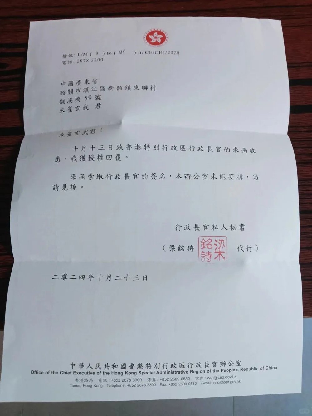 我曾经写信寄到香港特别行政区行政长官办公室,想要行政长官的签名,虽然没能成功,但收到了回信,我还发了社交媒体留念。