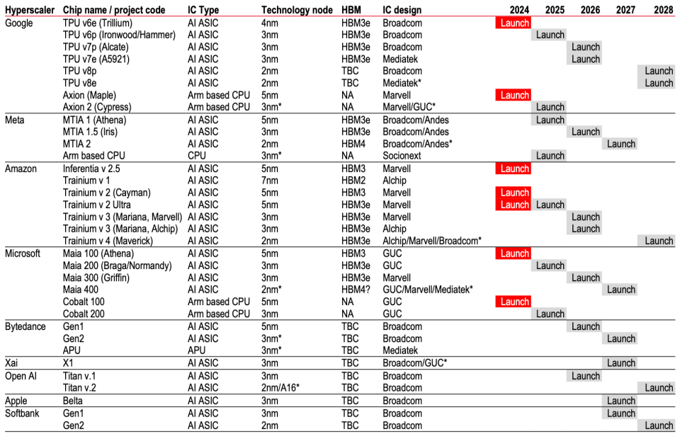 科技公司自研芯片路线图,标红为已发布,*代表待确认,来源HSBC