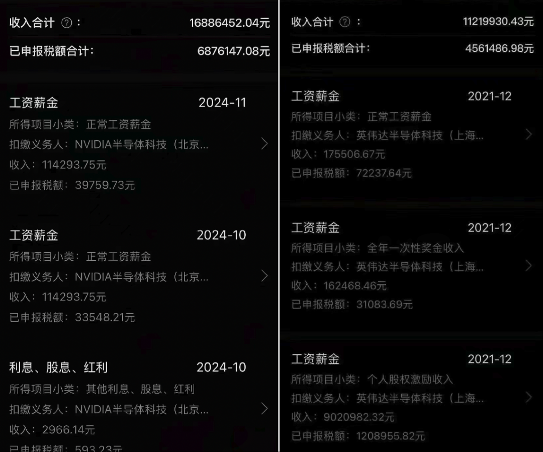 此外,近年来也有一些英伟达中国公司的员工在社交媒体上晒个税申报记录。2024年一位用户在小红书上发布的个税申报截图(下图左)显示,疑似英伟达北京公司的一名员工2024年度平均月薪11.42万元,年度累计收入合计1688万元。