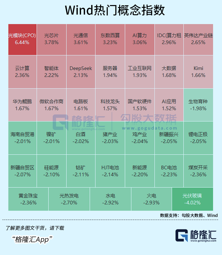 受此消息影响,今天开市后A股英伟达概念、算力租赁、服务器、CPO等板块集体逆势走高,成为当天最热方向。其中三大CPO核心龙头“易中天”收市涨幅显著,新易盛20CM涨停,中际旭创大涨超16%,天孚通信大涨12%,此外胜宏科技、东山精密、用友网络、润泽科技等多只细分领域核心龙头涨幅也达到了10%以上。