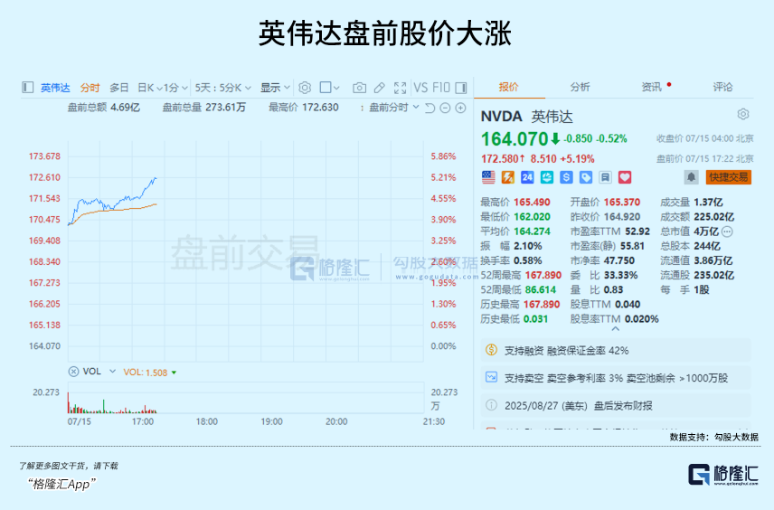 受此影响,美股英伟达夜盘交易也强势走高,盘前一度涨超5.19%报172.58美元/股。