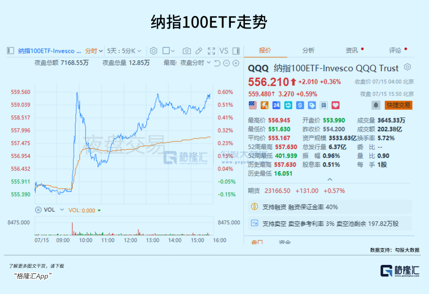 所以消息传出后,除英伟达外,其他多只美股芯片半导体科技巨头的夜盘股价同样明显异动,台积电夜盘一度上涨达2%,博通上涨近1.3%,阿斯麦、AMD、应用材料公司等均涨超2%。同时美股纳指受此刺激在夜盘阶段也一度涨超0.6%。