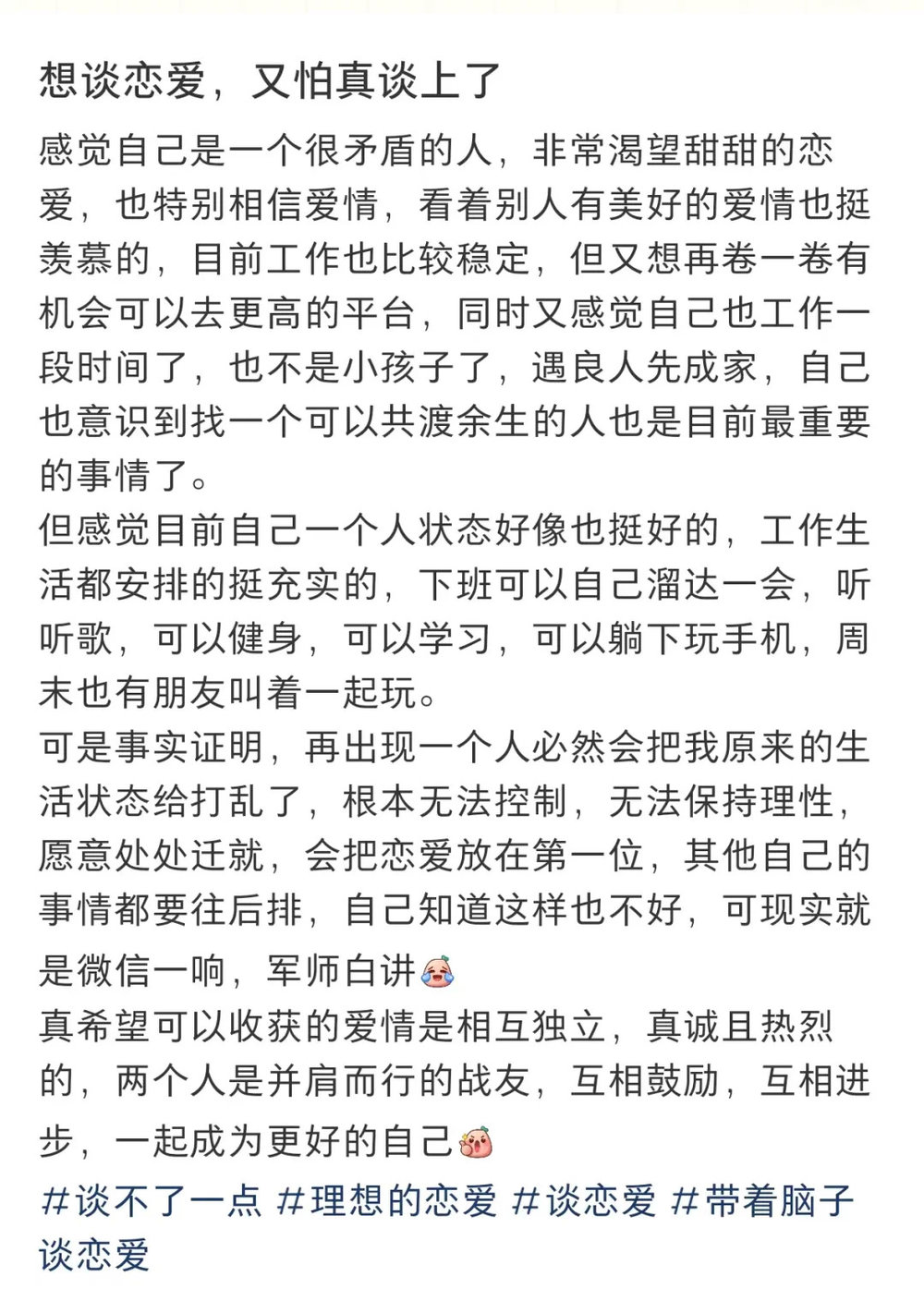 最近我刷到一个帖子,标题叫做“想谈恋爱,又怕真谈上了”。