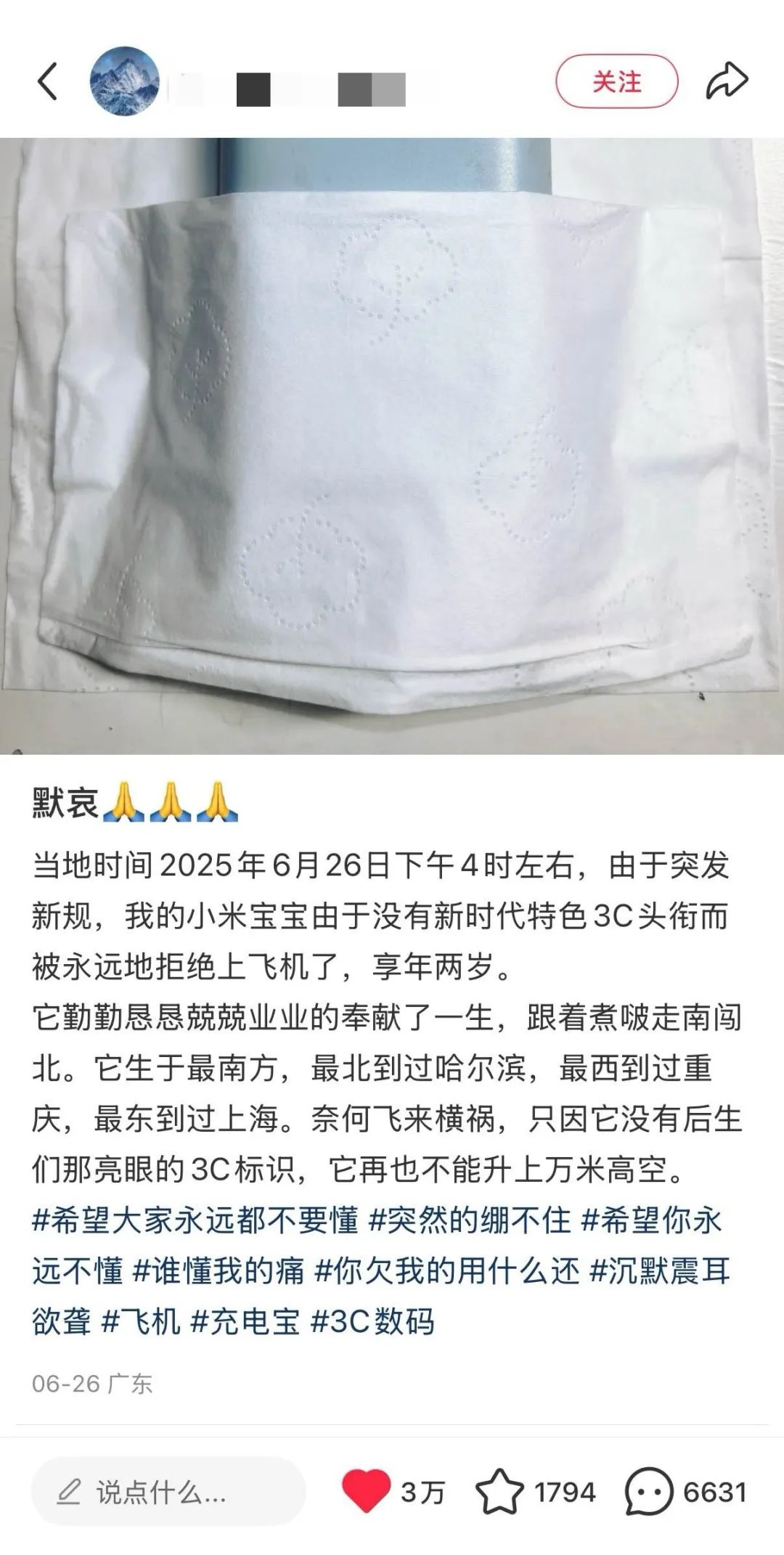 如果只是充电宝存在隐患,大家还有选择的余地。但6月26日,民航局的通知一出,对于需要坐飞机的人来说,2024年8月之前购买的充电宝的价值就几乎消失了——在没有3C的充电宝禁售之前,消费者们买到的大多数都是没有3C标识的充电宝,但这些充电宝的使用期限一般都是5年。
