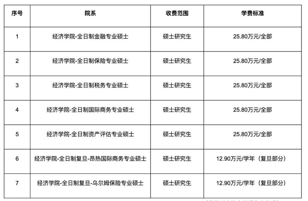 复旦大学也在跟进涨价。据最新发布的复旦大学经济学院专业学位硕士学费收费标准,经济学院-全日制金融专业硕士的学费为25.80万元/全部,比此前的21.80万元/全部涨了4万元。