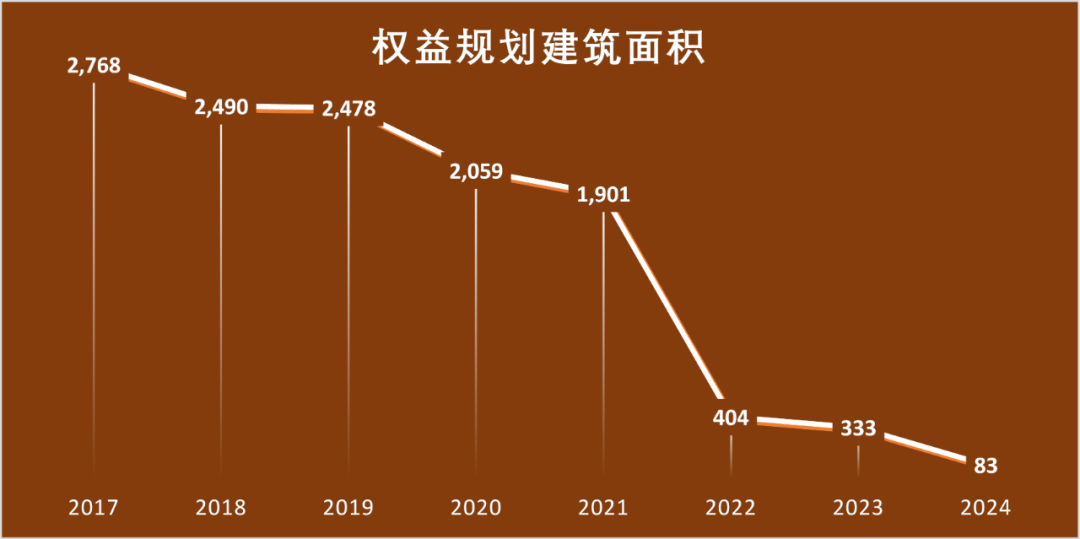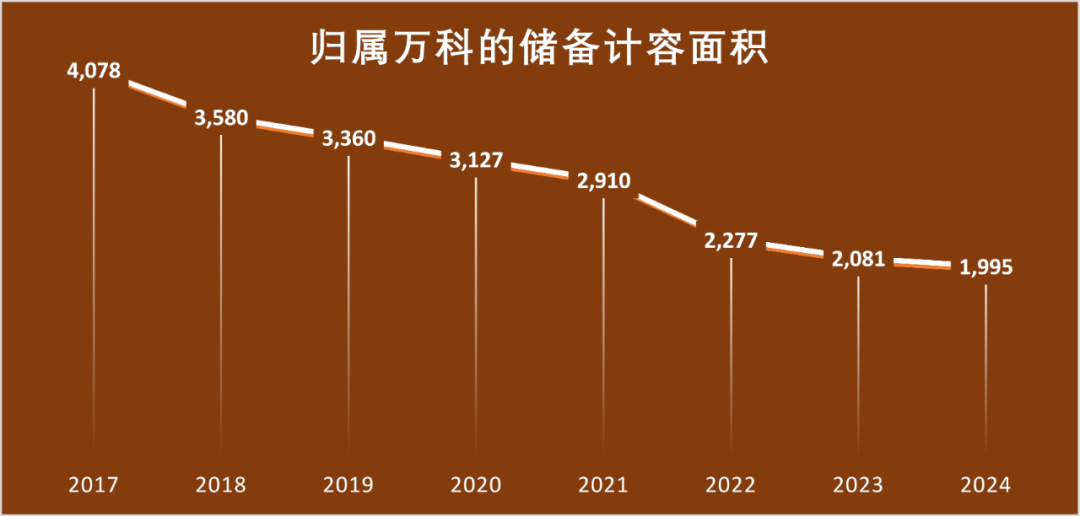 再来看看土地储备数据。万科的土地权益储备一直在下降,至2024甚至只有2017年土储的一半。