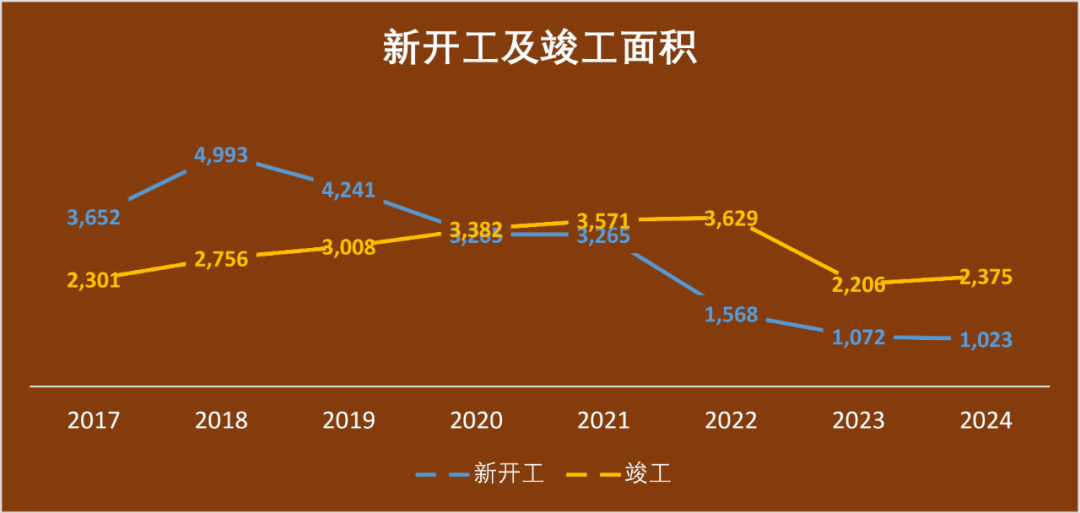 新开工的面积也是逐渐下降,但是变化幅度没有那么显著。但竣工面积则逐年稳步上涨,直到2023年才有相对显著的下滑。