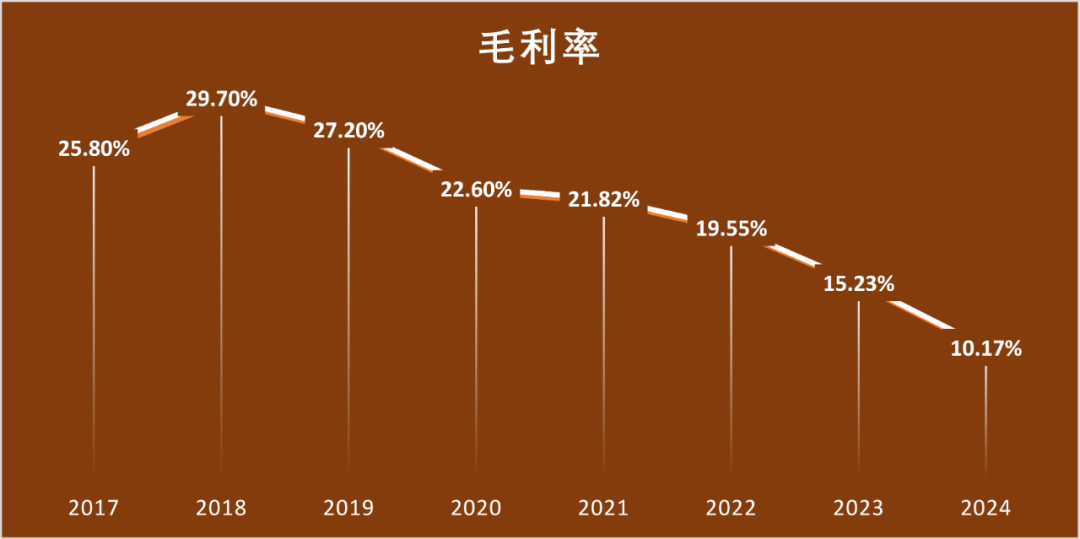 毛利就是收入减去成本,好比你花6块钱买面粉做面包,卖了十块钱获得了收入。那么毛利率就是40%。万科毛利在2018年达到顶点约29.7%后持续下滑,直至2024年跌至10.1%。七年间万科毛利率掉了20%,实在是有点恐怖。