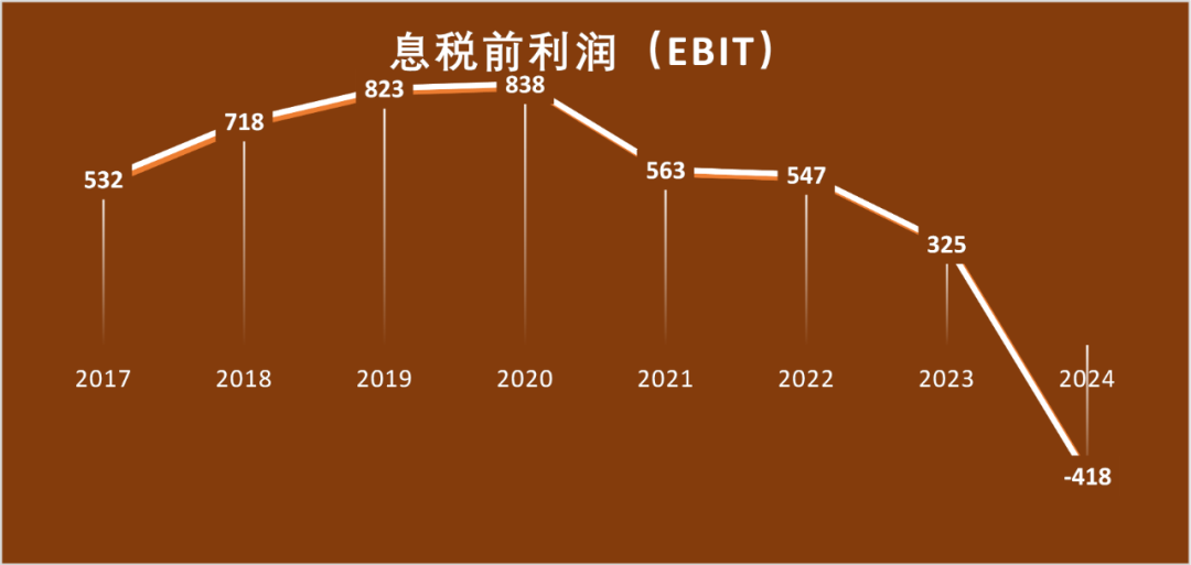 息税前利润2020年见顶,2021-2023年略有下滑但也维持在正常的300亿以上水平,只是到了2024年扣除345.4亿的存货跌价准备和信用减值后,息税前利润来到了-418亿,这一上一下息税前利润差额高达743亿!