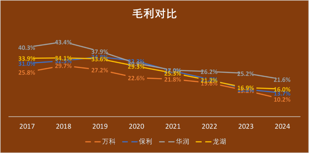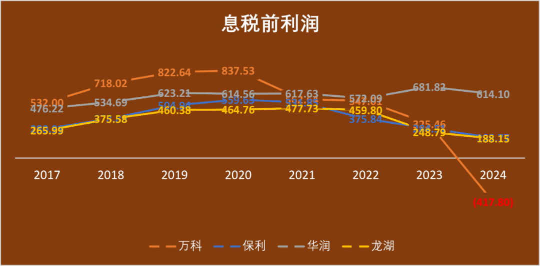 万科在息税前利润这项指标上,在2023年之前与其他几家保持了几乎一致的水平甚至略好。但2024年,华润稳住了并遥遥领先,万科巨亏,保利和龙湖则呈现缓慢下滑趋势。