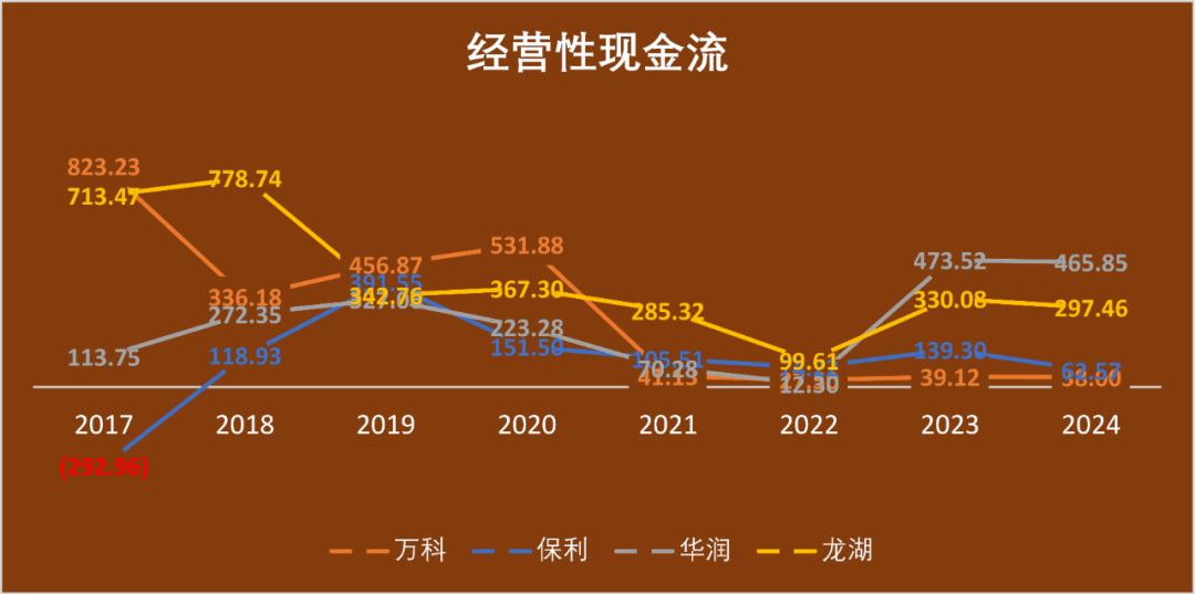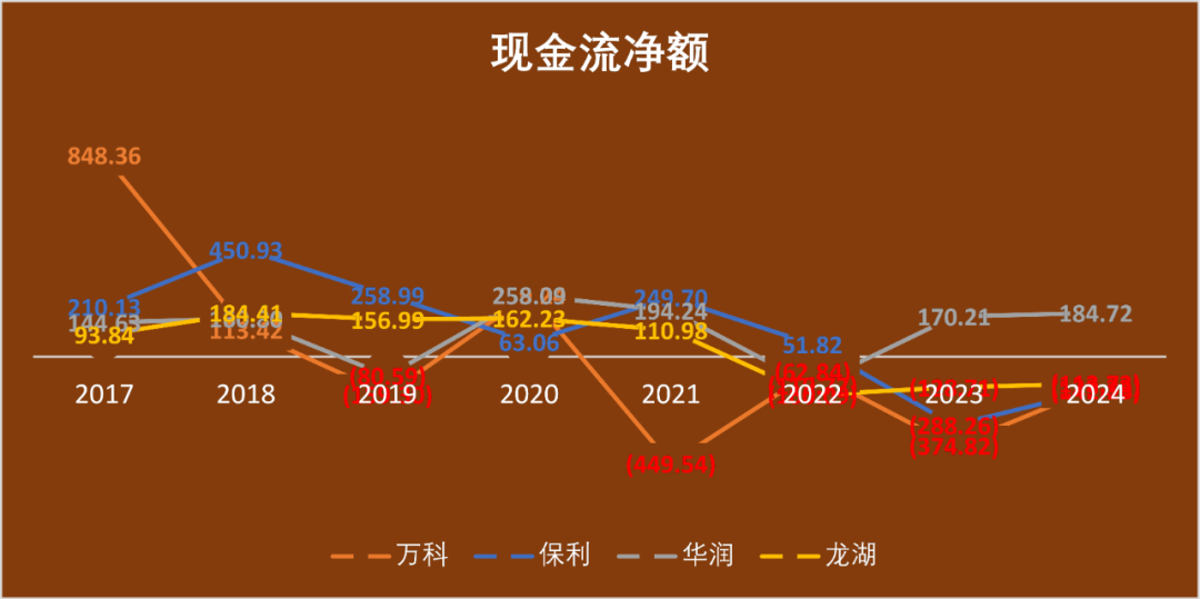 在现金流净额上,2022年仅有保利一家为正,2023-2024年仅有华润一家为正,可见行情有多么严峻。