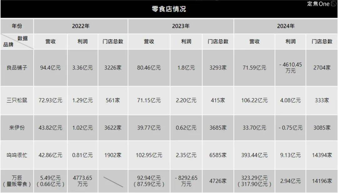 昔日的万店野心,也逐渐收缩。来伊份在2017年提出在2023年实现“万家灯火”计划,但2024年门店同比减少16.28%,仅剩3085家;三只松鼠也在2019年提出“万店目标”,截至2024年底,线下门店仅333家。