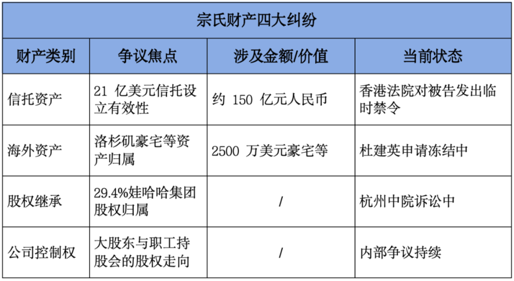 目前,宗氏财产纠纷主要在于四个部分:信托资产、海外资产归属、股权继承、公司控制权。